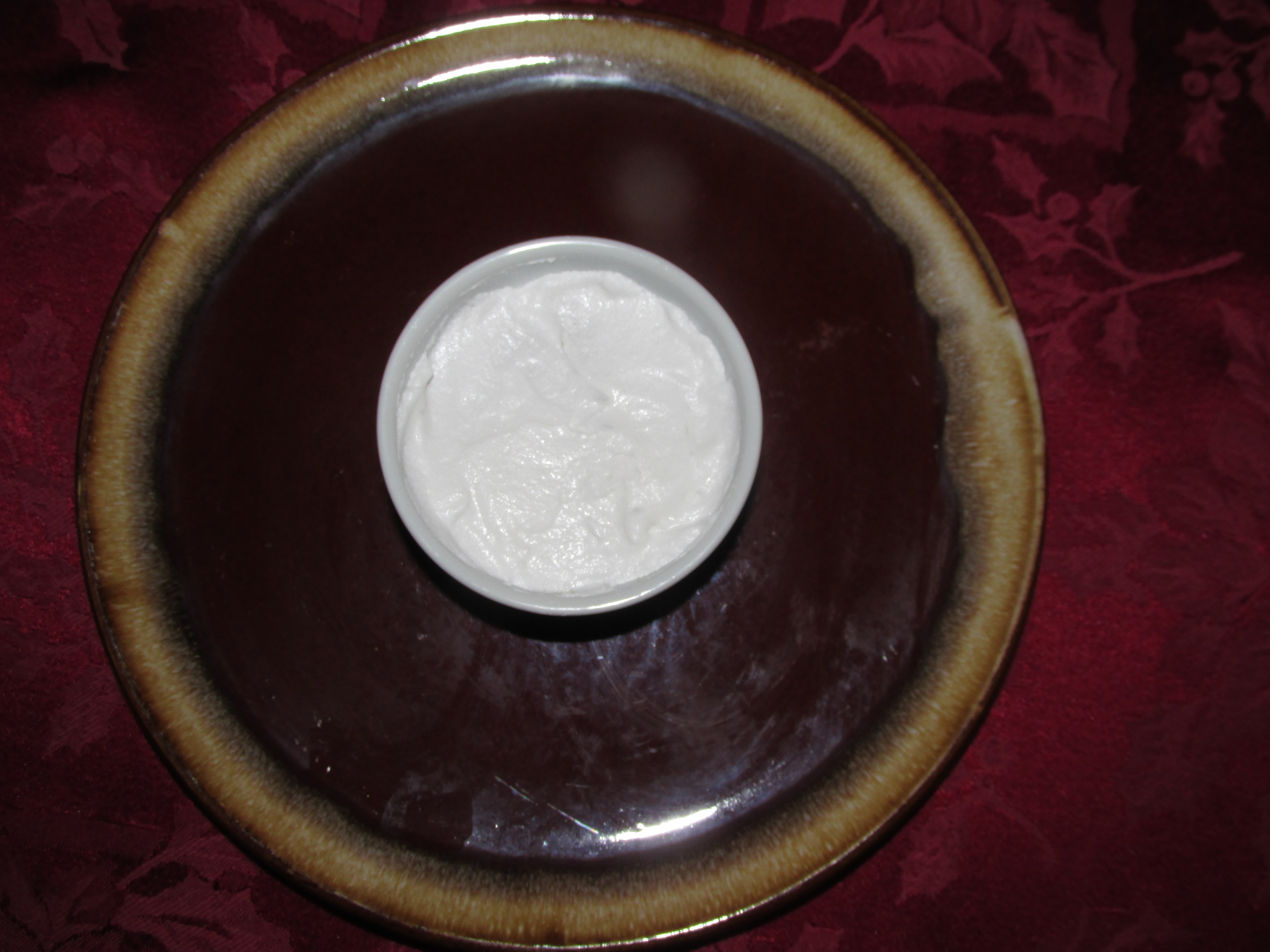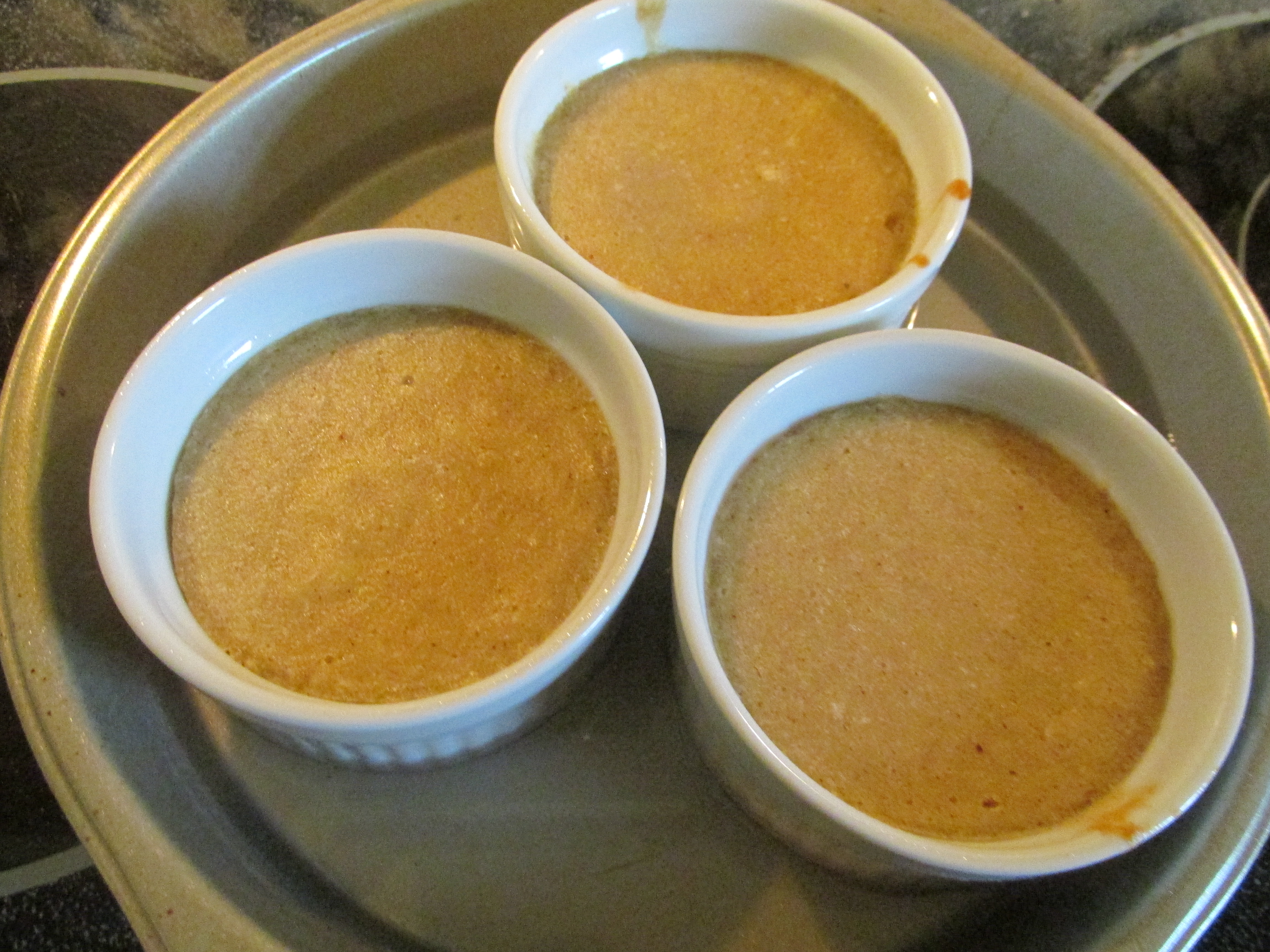 This mixture gave 5 ramekins, which were baked in a larger pan. The ramekins sat in an inch of hot water and baked in a 350-degree oven for 40 minutes. Then I whipped an egg white with a tablespoon of sugar and spread the meringue over the top.