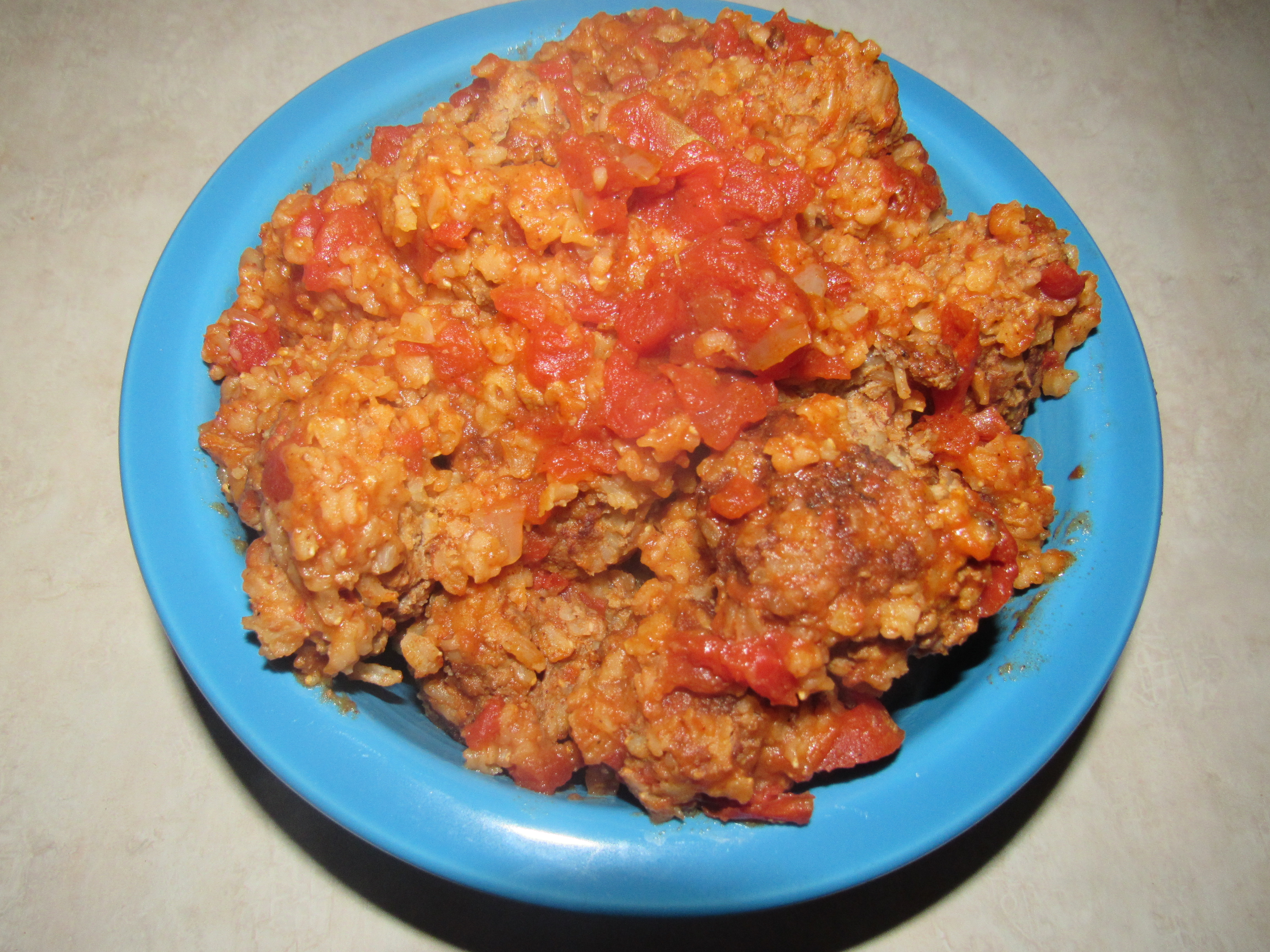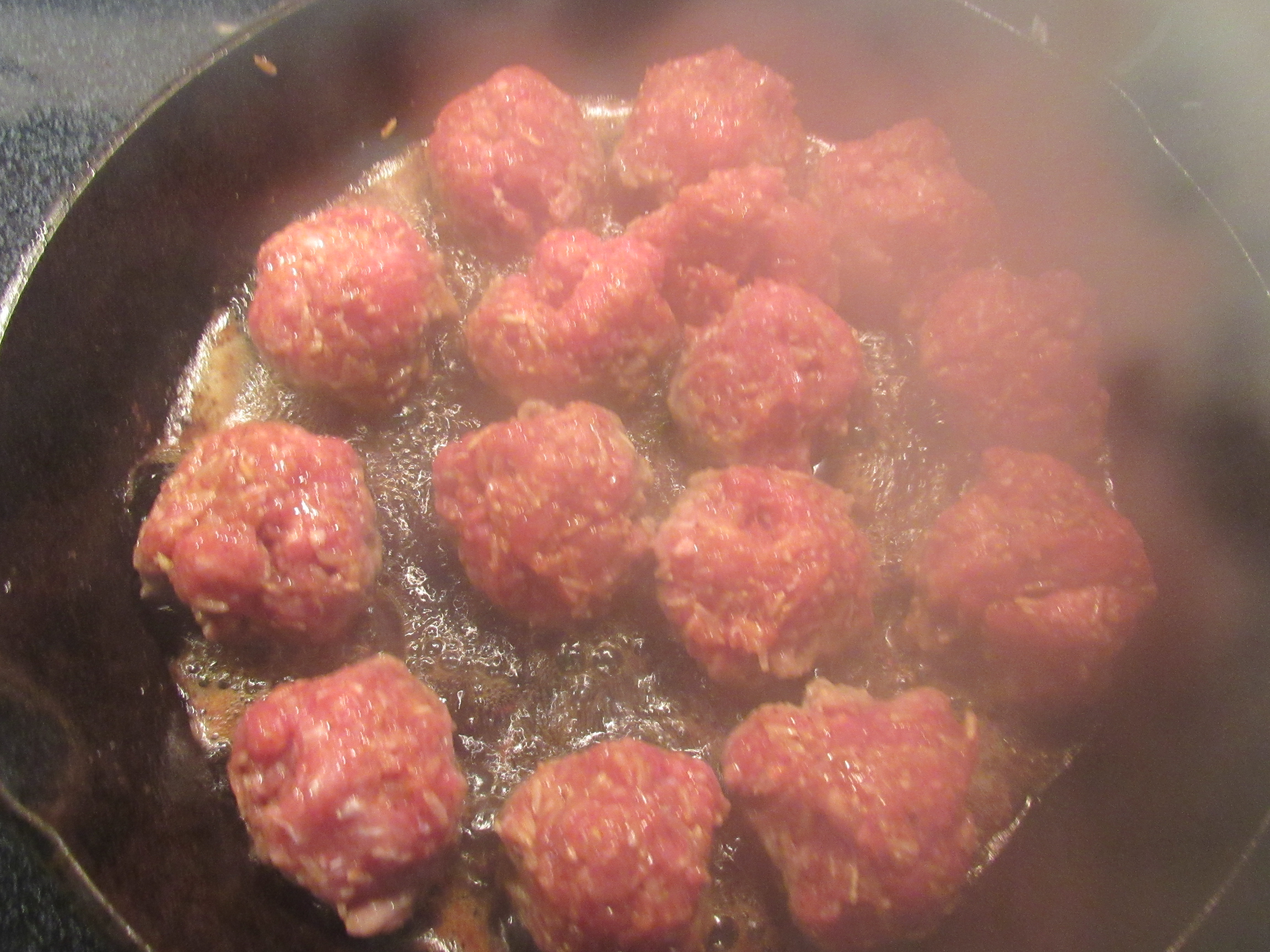 Mix the meats together. (You might as well use your hands—a method my grandmother taught me. Sometimes spoons just don’t work as well as your fingers.) Beat the egg in a separate bowl and then add egg, milk, 2/3 cup rice, 1 teaspoon chili powder, and 2 teaspoons salt to the meat mixture. Mix well. Form into 1 ½ inch meatballs. (My batch made about 25 meatballs.) Melt about 2 tablespoons of shortening into a skillet. Brown meatballs in batches and drain on a paper towel. Add shortening as needed for browning.