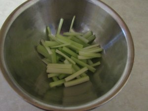 Wash 2 celery stalks. Cut the stalks into 2-inch sections and then slice them lengthwise.