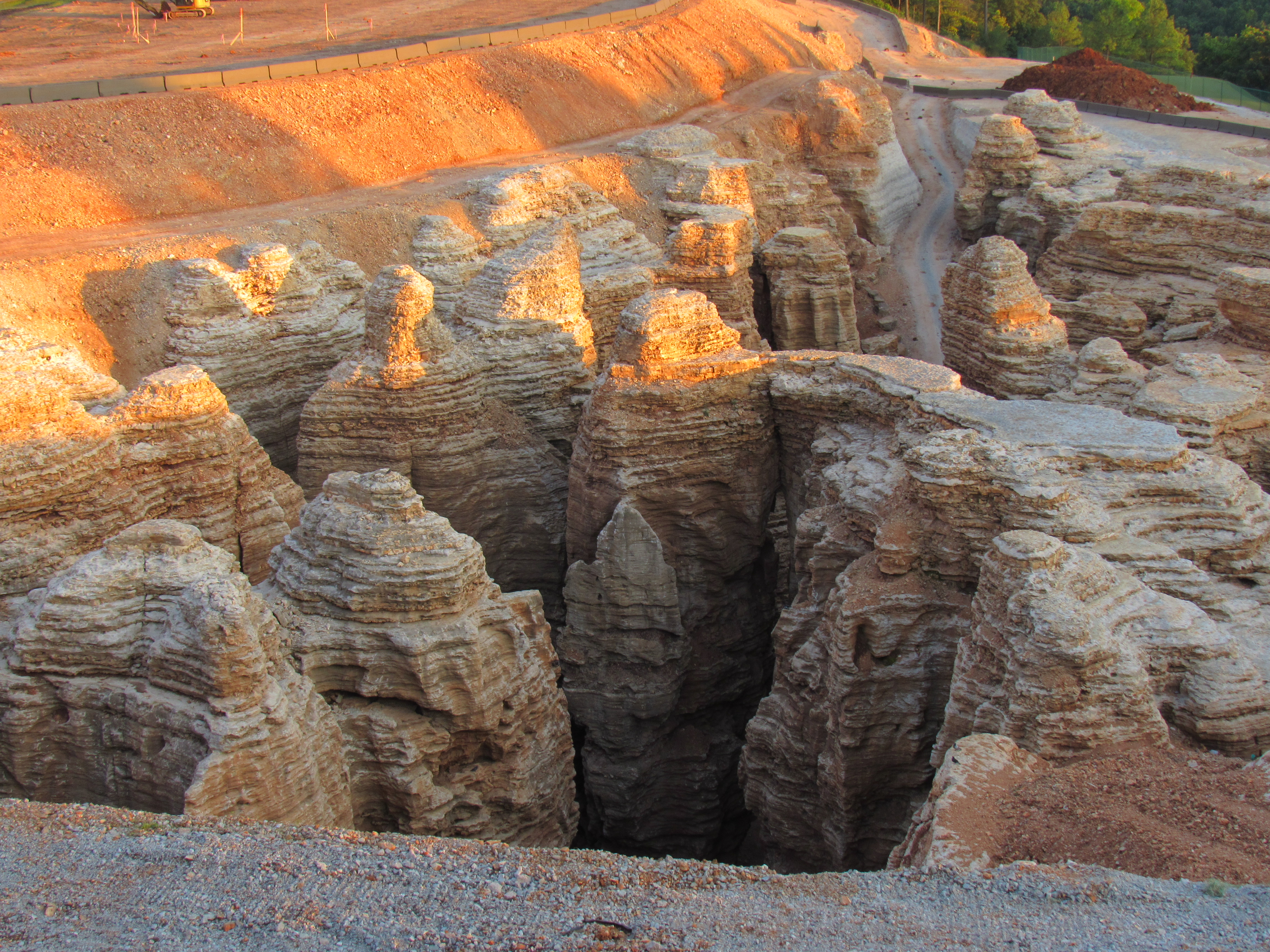 Excavations crew have removed dirt and rock. The original 70-foot wide sinkhole is now 350 feet across. The depth of 40 feet has been expanded to 200 feet. Gorgeous!