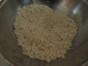 Sift together the flour and salt. Cut in the shortening (she always used Crisco … so do I) with a pastry blender or a fork until the pieces are the size of small peas.