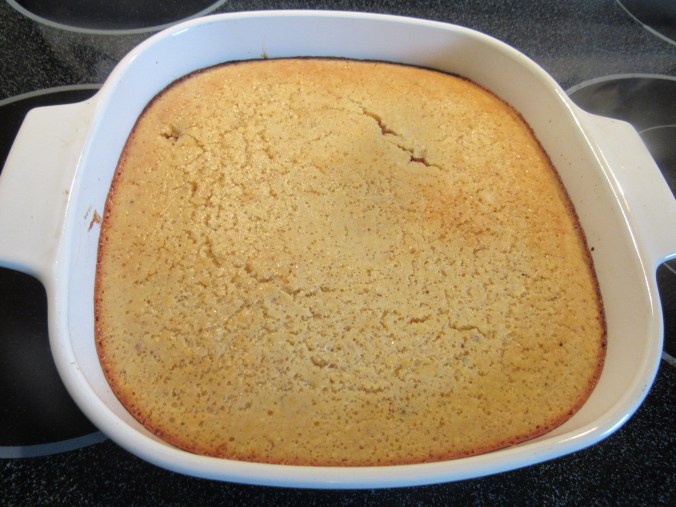 Since I was using this batter for another recipe, I didn’t bake it. I set it aside until needed. It made a delicious topping for the corn pone pie.