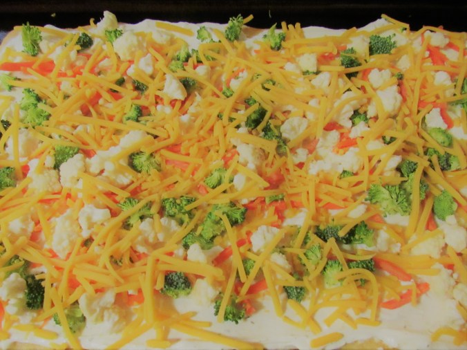 Spread the Ranch dressing mixture over the crust once it cools. Scatter the veggies, one type at a time, over the dressing mixture. Top with cheddar cheese.