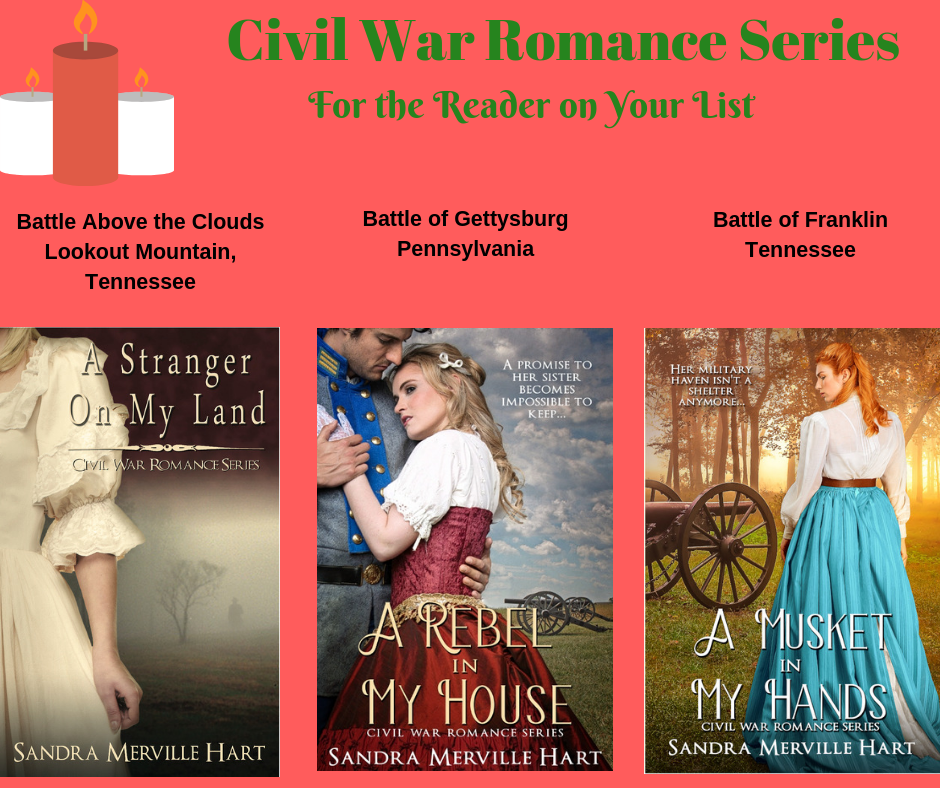 There will be about a dozen other authors at the book festival available to sign books including me, Sandra Merville Hart. I will have my historical romances there–A Stranger on My Land , A Rebel in My House, A Musket in My Hands, From the Lake to the River, and The Cowboys Smitten Collection–as well as a brand new Christmas collection, Christmas Fiction Off the Beaten Path!