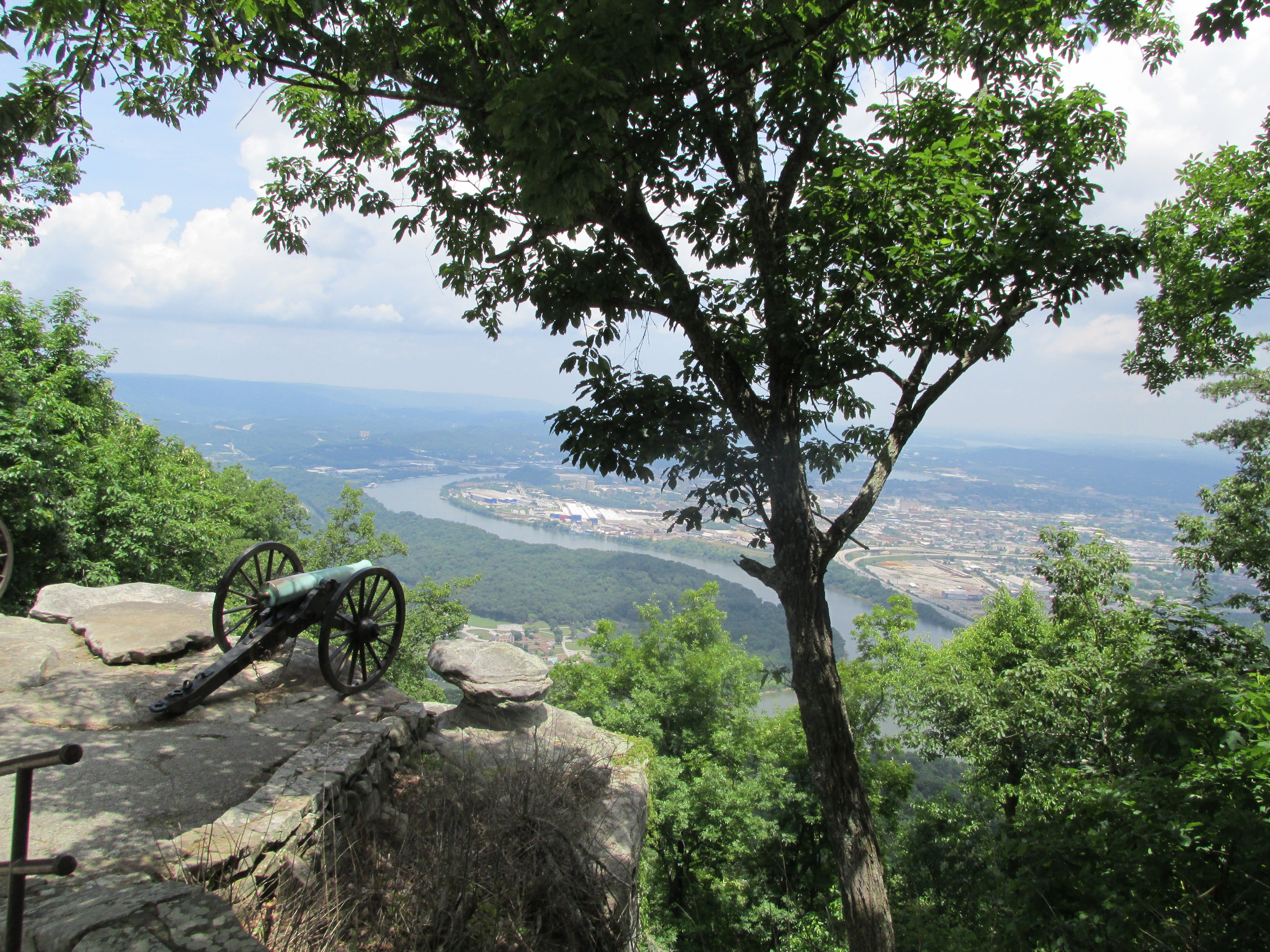 View of Confederate cannons by a rocky cliff with Tennessee River and Chattanooga in the background