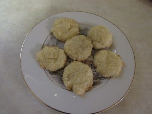 Preheat oven to 425 degrees and prepare a cookie sheet with cooking spray. (The original recipe says to use butter on the baking pan. That probably enhances the buttery flavor of the crisp.)