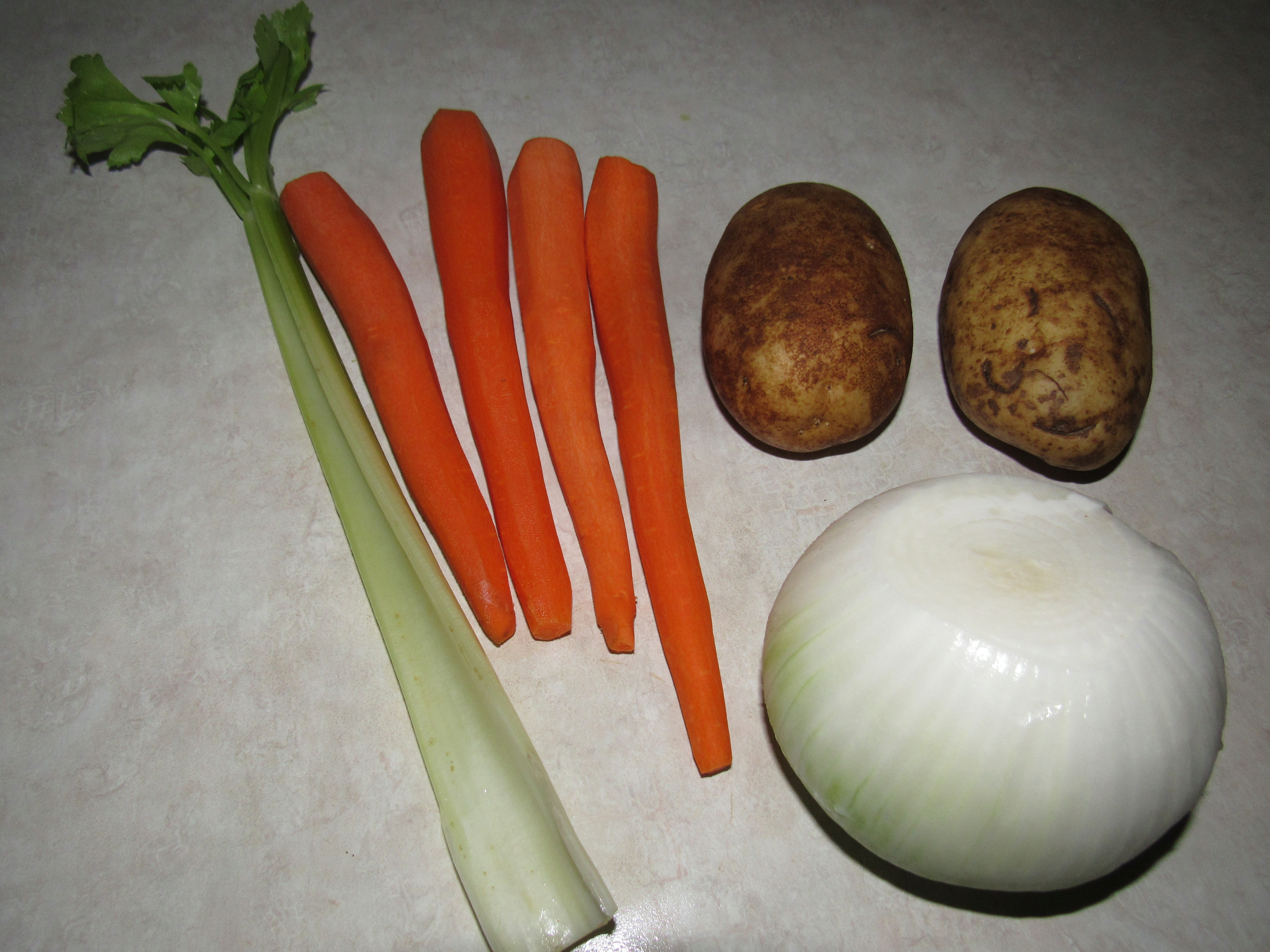While those vegetables are cooking, peel and dice 2 medium potatoes. Chop 2 sprigs of parsley.