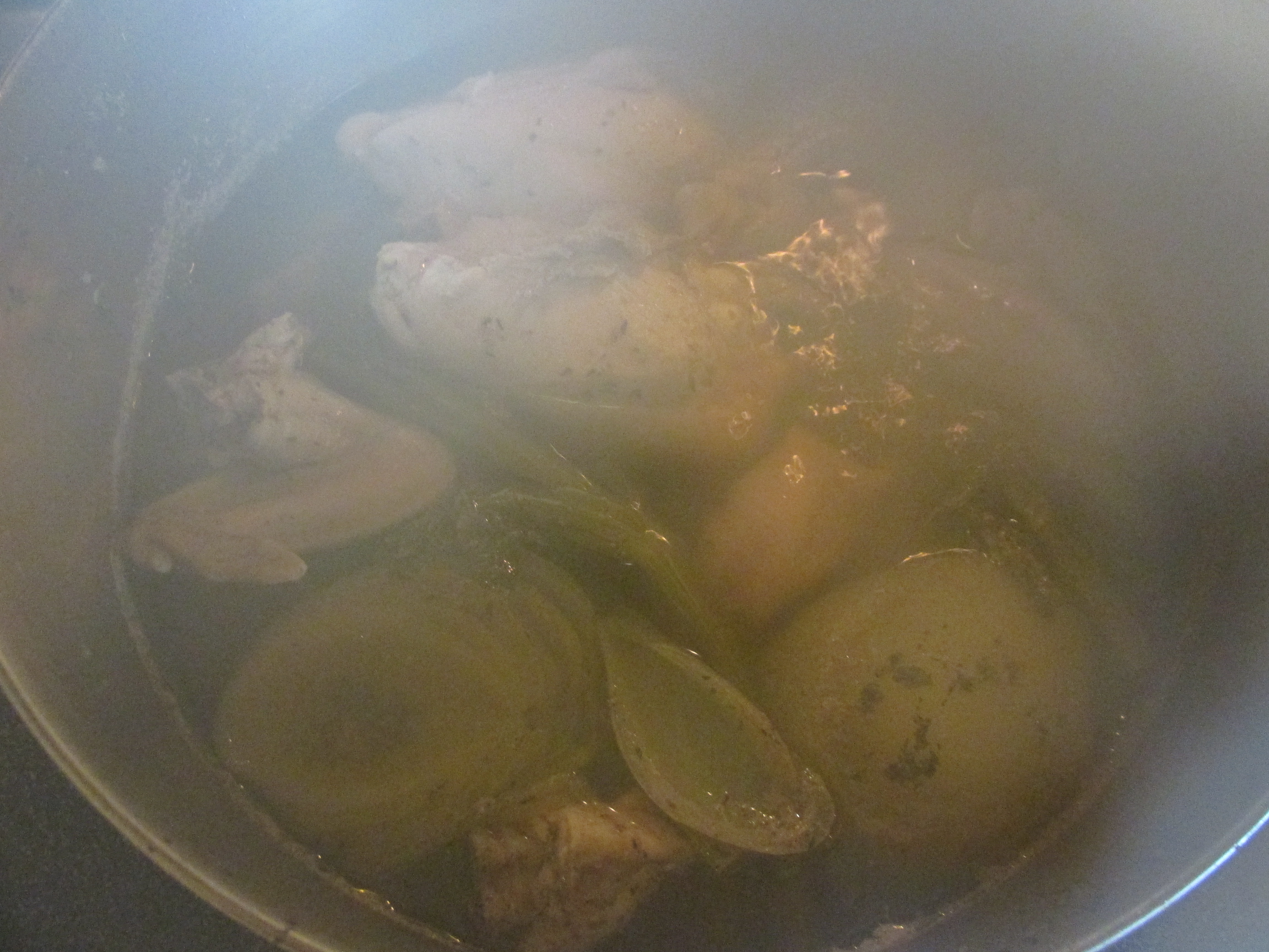 Cook on medium high heat until water begins to boil then reduce to simmer. Partially cover and simmer for 2 ½ hours. If you plan to use the stew beef in another recipe, remove it now and refrigerate for later use. I used a slotted spoon to take out the beef and scalded my hands a couple of times, so be careful.