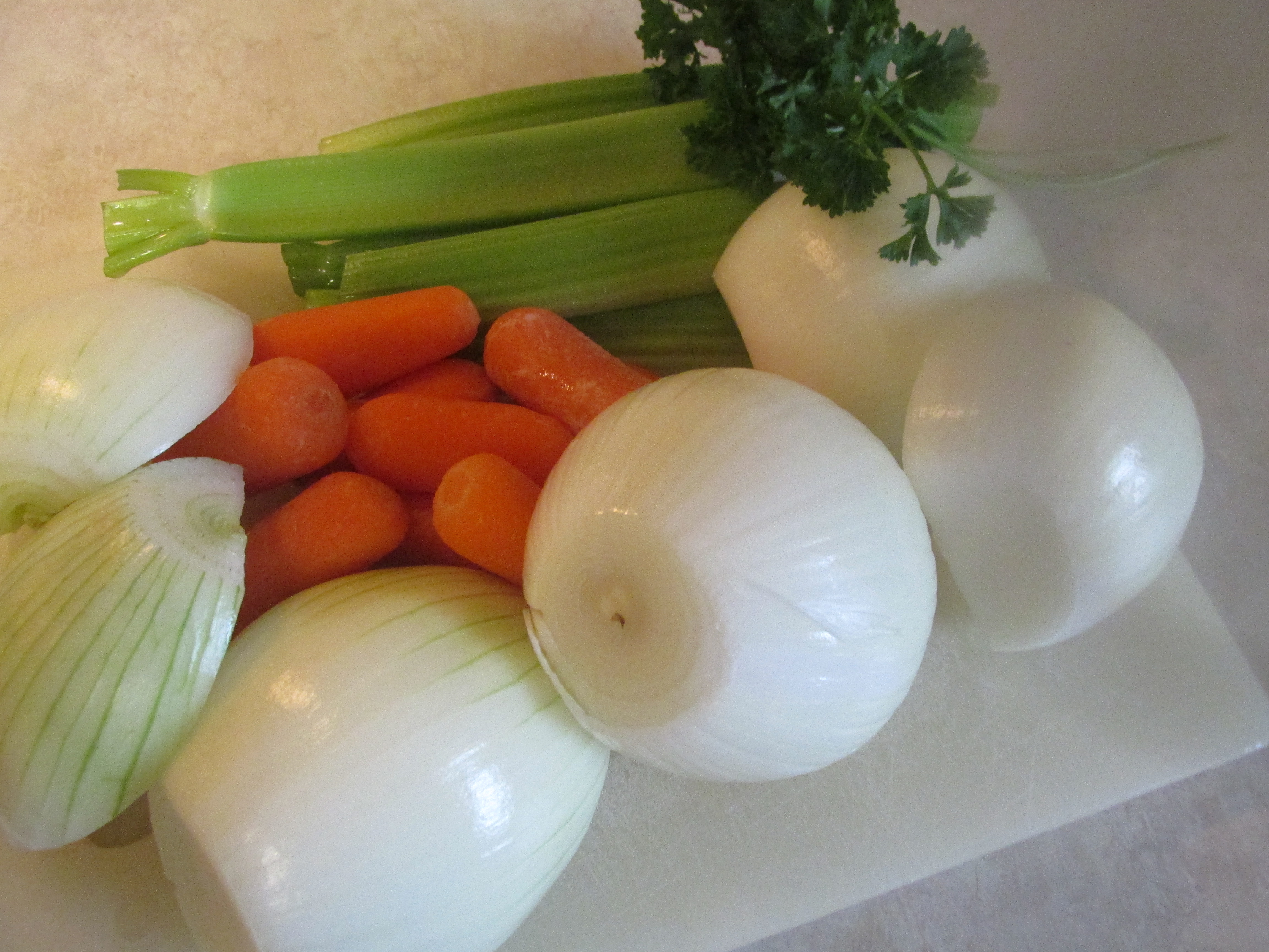 The recipe calls for 3 sliced onions. Having already made chicken stock, I knew that vegetables are discarded at the end as they are limp from the cooking process. I decided to save time and cut the onions in halves. Three celery stalks were cut in half. I set aside the onions, celery, and nine baby carrots.