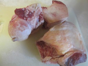 My local butcher didn’t have any marrow bones on hand, so he cut another bone into three chunks about the size of my palm. They weighed less than two pounds—the recipe called for two and half pounds with an equal amount of lean stew beef. I took what they had and purchased two and half pounds of stew beef.
