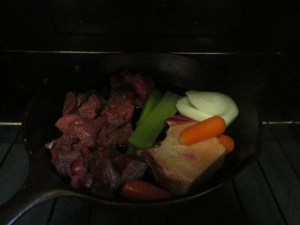 Fannie suggested using a roasting pan to brown the meat and vegetables in the preheated oven. In hindsight, that would be quicker because everything will fit at once. I used a cast iron skillet where all the ingredients didn’t fit. It took three different browning sessions to cook everything.