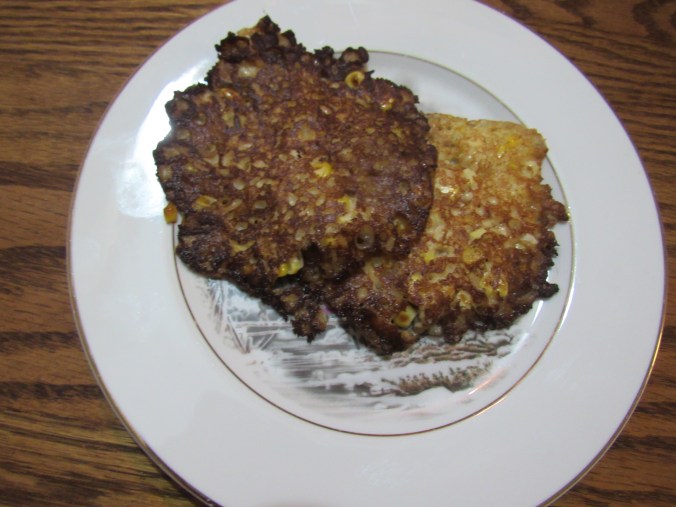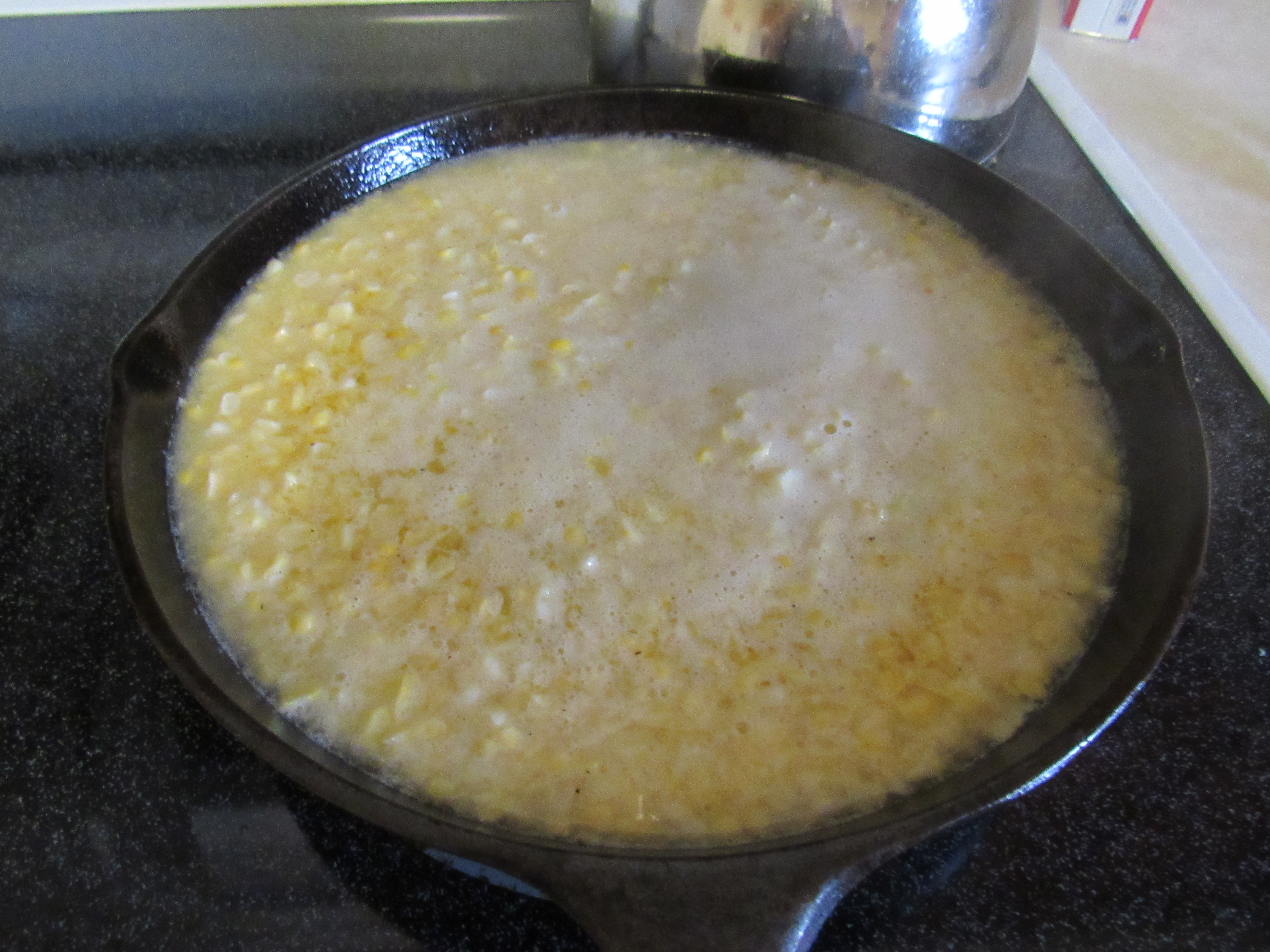 Stir ¾ cup milk into 1 ½ cups of fresh corn. Add ¼ cup flour, 1 teaspoon butter, and 1 beaten egg. Salt and pepper to taste—I added ¼ teaspoon of each.