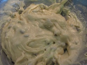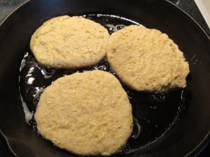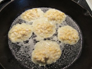 Use a tablespoon to drop batter into the skillet. The batter is very runny and it flattens out like a small pancake. Watch carefully as it browns quickly. Then flip it over. This seems to be an acquired art as I tore several fritters while turning them.