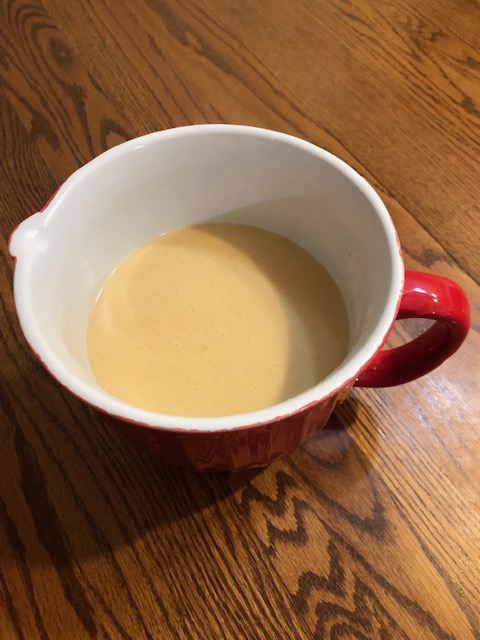 Mix eggs, pumpkin, and spices in the order given. I’m never stingy with the cinnamon in this recipe, making it a heaping teaspoon or almost doubling the amount required, just as my mother did.