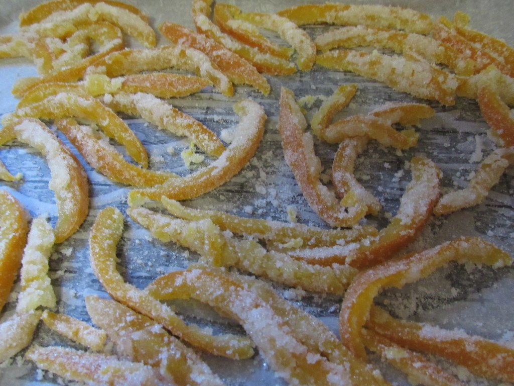 Set aside the peel to dry on a sheet of parchment paper. I set mine on a lined baking sheet and it took 2 days for them to dry.