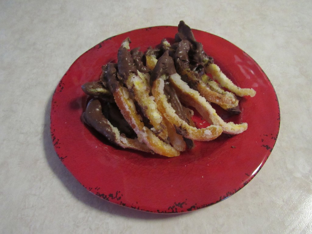 8 oz chocolate, melted (optional—and for later, will use this after the peels dry)