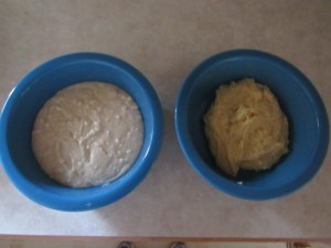 Spray an 8 x 8 baking pan with cooking spray. Spoon in the batter, alternating gold and silver.