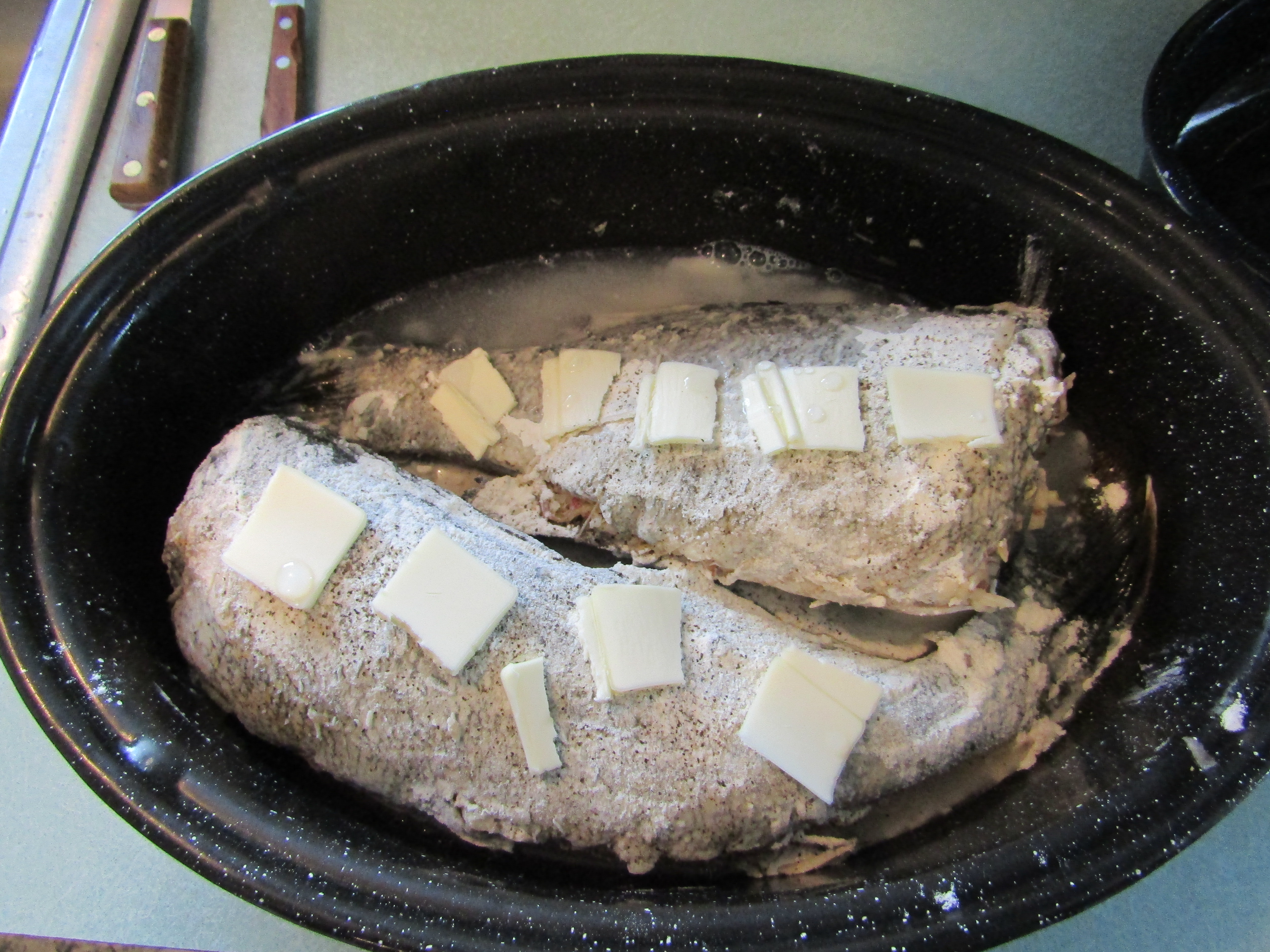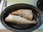 I’ve never been very good at following recipes. I view them as loose guidelines. To be historically accurate, we should have left the heads on the fish. But today’s diner has a bit of an aversion to an entrée that stares back from the platter. So the heads were removed. I grated the potatoes instead of chopping fine. It was faster. I have no idea what poultry savory is, so I used salt, pepper, and a little rubbed sage. The recipe doesn’t say whether or not to cover the roasting pan, so I did. A slow oven is about 325 degrees, and that worked out perfectly at an hour and a half.